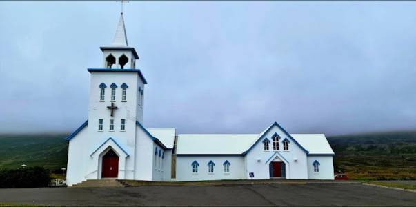 "Simple and humble white church sitting on the hill side of Dalvik town, quiet and secluded. Beautiful. Unfortunately we did not get to visit inside the church."